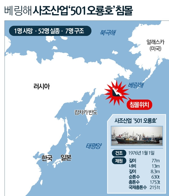 한편 '501오룡호' 침몰사고 사흘째인 3일 러시아 베링해에서 조업하다가 침몰한 501오룡호 승선원으로 추정되는 시신이 잇달아 발견됐다.