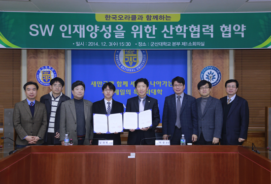 군산대학교(총장 나의균)는 3일 군산대학교 본부 제 1소회의실에서 한국오라클유한회사(사장 김형래)와 SW인재양성을 위한 교류협정을 체결했다. 협약식에는 군산대 나의균 총장, 한국오라클 김욱현 영업대표, 군산대학교 주요 보직자, 새만금ICT융합인재양성단 교수 등이 참가했다.