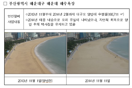 이 같은 결과는 연안침식에 직접적으로 영향을 미치는 3.0m이상 고파랑 출현율이 2013년에 비해 평균적으로 25% 감소하였고, 강우량도 30% 증가하여 하천으로부터 모래유입이 늘어나는 등 기후 요인이 유리하게 작용한 데 따른 것으로 분석된다. 또, 최근 해운대해수욕장 복원사업과 같이 연안침식이 발생한 지역을 중심으로 정부가 지속적으로 시행해오고 있는 연안정비사업도 침식지역 감소에 기여한 것으로 파악된다.