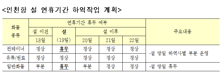 특히 18일부터 20일까지 3일간의 ‘집중관리기간’ 중에는 설날인 19일 하루를 제외하고 관계기관 및 주요 업・단체와의 비상연락망이 전면 운용돼 긴급한 하역작업 요청이나 비상상황 발생에 대한 대처가 이뤄질 예정이다.