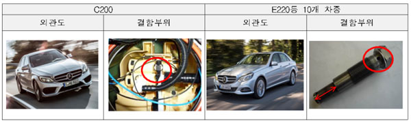 C200 승용자동차는 연료탱크 내에 장착된 연료 공급라인 결함으로 시동꺼짐이 발생하고, E220 승용자동차 등 10개 차종은 타이밍벨트 텐셔너 결함으로 인한 엔진오일 누유로 엔진룸에 화재가 발생할 가능성이 발견되었기 때문이다.