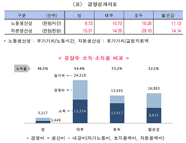 특히, 대추는 ha당 29,206천 원으로 생산비가 가장 많이 투입된 것으로 나타났으며 소득 또한 ha당 13,354천 원으로 가장 높았다.