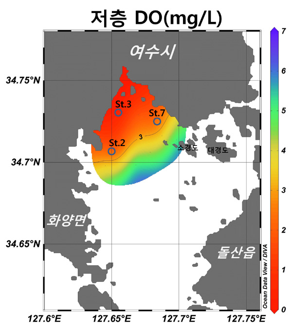 전남 여수시 가막만 해역에 빈산소수괴(산소부족물덩어리) 발생으로 양식장의 각별한 주의가 요구된다.