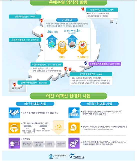 에너지 신산업인 온배수열 활용으로 에너지비용을 절감하여 우리 양식산업의 경쟁력을 제고하고 고사(枯死)위기에 있는 중소조선소를 살리기 위해 양 부처가 적극 협력에 나서기로 한 것이다.
