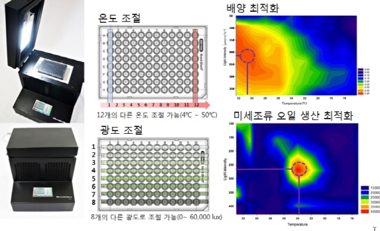 김희식 박사 연구팀은 포토바이오박스를 이용하여 미세조류 12종의 성장 및 오일 생산의 최적조건을 파악하기 위한 실험을 수행했다.