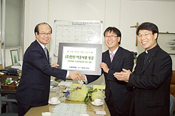 기부금 전달 행사에는 이창준 서울카톨릭사회복지회 사무총장과 김경철 ‘가난한 마음의 집’ 원장, 김기선 한진 택배사업본부장, 양태규 한진 택배영업담당 상무를 비롯 양측 관계자 10여명이 참석했다.(사진설명:왼쪽부터 김기선 한진택배사업본부장, 가난한 마음의 집 김경철 원장,서울카톨릭 사회복지회 이창준 사무총장)