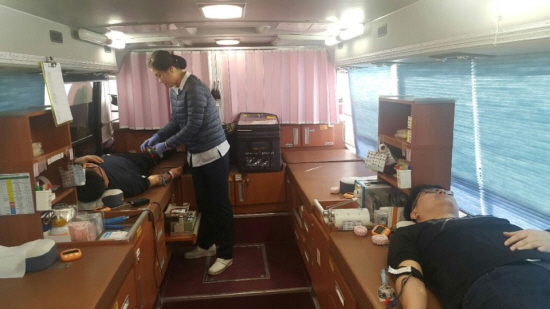 (사진 : 인천항만공사 직원들이 헌혈버스에서 ‘사랑의 헌혈나눔’에 동참하고 있다.)