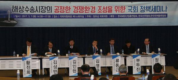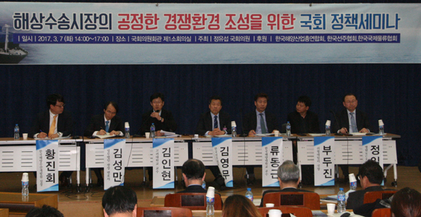 정유섭 국회의원이 주최하고 한국해양산업총연합회, 한국선주협회, 한국국제물류협회가 후원한 “해상수송시장의 공정한 경쟁환경 조성을 위한 국회 정책 세미나”가 7일 오후 국회의원회관 제 1 소회의실에서 개최됐다.