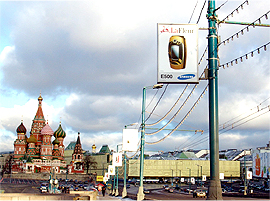 이로써 러시아 휴대폰 시장에서 2004년, 2005년에 이어 3년 연속 판매량과 매출 기준으로 동시에 1위를 이어갔다. 특히 매출 분야에서 10억 2900만 유로를 기록해 러시아에 진출한 휴대폰 업체에서 처음으로 연 매출 10억 유로를 돌파했다. (사진설명= 삼성전자의 '라 플로' 컬랙션광고가 모스크바의 대표 관광명소 '성 바실리 성당'앞에 설치되어 있는 모습)