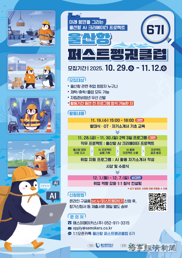 울산항만공사(UPA)는 지역 청년의 취업 경쟁력 강화를 위한 실무형 프로그램 ‘울산항 퍼스트펭귄 클럽 6기’ 참가자를 11월 12일 수요일까지 온라인으로 모집한다.