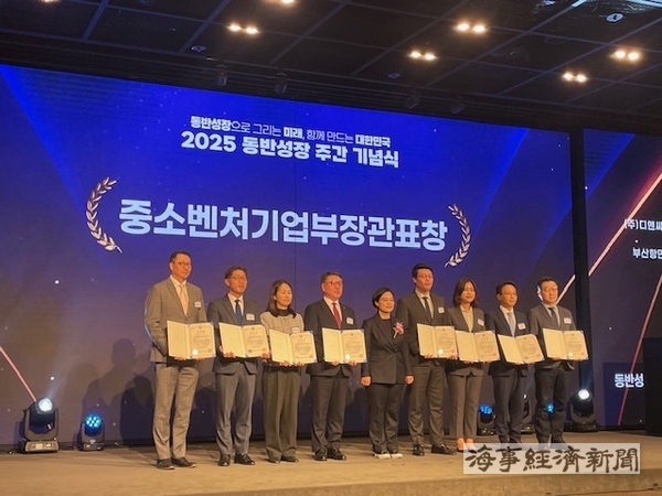 부산항만공사(BPA, 사장 송상근)가 25일 서울 중소기업중앙회에서 열린 ‘2025 동반성장 주간 기념식’에서 중소벤처기업부 장관 표창을 수상했다. 지난해 대통령 표창에 이은 2년 연속 정부 포상으로, BPA는 동반성장 분야 우수 공공기관으로서의 입지를 다시 한 번 확인했다.