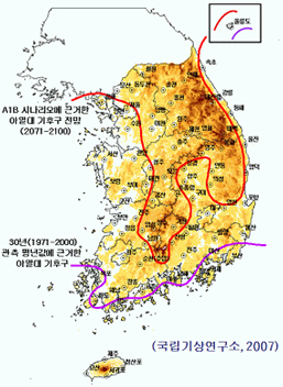 특히 경제규모와 인구증가 등을 고려해 작성된 3개 온실가스 배출 시나리오를 이용해 모의한 결과 이산화탄소 배출량에 따라 기후온난화 추세가 크게 나타날 것으로 예상했다. 이로 인해 21세기말 우리나라에서 태백ㆍ소백산맥 산지를 제외한 서해안, 동해안 중부까지 아열대 기후구 북상현상이 나타날 것으로 전망했다.