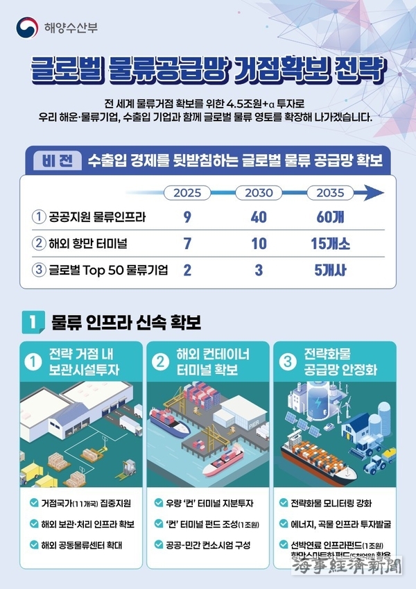 해양수산부는 글로벌 물류공급망 불확실성에 대비해 수출입 물류를 안정적으로 지원하기 위한 ‘글로벌 물류공급망 거점 확보 전략’을 마련하고, 12월 16일 산업경쟁력강화 관계장관회의에서 발표했다고 밝혔다. 정부는 이번 전략을 통해 2030년까지 해외 물류 기반과 항만 터미널을 늘리고, 해외 진출 물류기업에 대한 금융·정보·현지 정착 지원을 전주기로 강화한다는 방침이다.
