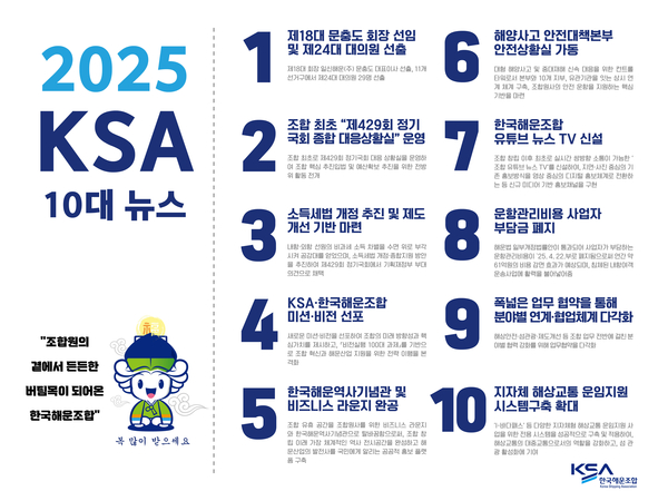 한국해운조합이 2025년 한 해 주요 이슈와 성과를 정리한 ‘10대 뉴스’를 발표하며, 조합 운영 변화와 제도개선 대응, 안전체계 강화, 디지털 홍보 확대 등 추진 결과를 공개했다.