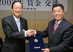 이번 대한항공 노조의 임금교섭 전권 일임 결정은 회사가 비용 절감과 생산성 향상 노력을 기울여 좋은 성과를 거두고 있는 가운데 나온 것으로, 노사 상호간의 신뢰를 공고히 하는 계기가 될 것으로 기대되며, 노동조합은 “회사가 ‘명품 항공사’로 발전하는데 힘을 더하고자 이 같은 결정을 내렸다”며, “노사간 소모적인 갈등보다 노사가 하나가 되어 대한항공이 치열한 세계 항공 시장에서 최고의 항공사가 될 수 있도록 기여할 계획”이라고 밝혔다. (사진:오른쪽 부터 이대규 대한항공 노조위원장이 이종희 대한항공 총괄사장에게 위임장을 전달하면서 활짝 웃고 있다.)