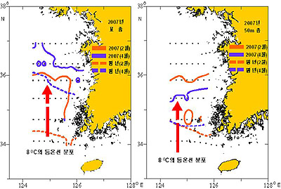 이상 고수온현상이 나타나는 한 예로, 8℃ 등온선 분포를 살펴보면, 평년과 비교하여 금년의 8℃ 등온선 분포가 상당히 북상한 특징을 보이고, 4월의 경우 8℃ 등온선 분포가, 표층에 비해 수심 50m층에서 보다 남쪽으로 남하하여 분포하는 양상을 보였다. 이는 지난 2월의 수온이 표층에서 5.39~12.51℃, 50m층에서 5.40~13.19℃의 분포 범위인데 반해, 4월의 표층수온이 6.40~11.63℃, 50m층에서 6.31~11.53℃의 분포 범위인 것을 고려할 때, 동계인 2월에 고수온의 상승폭이 4월에 비해 더 뚜렷하게 나타났음을 알 수 있었다.