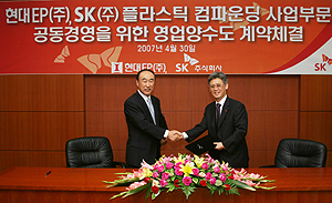 그동안 SK㈜는 플라스틱 소재 및 플라스틱 가공사업 분야에서 사용되는 폴리에틸렌(PE) 컴파운드와 자동차 부품용에 주로 사용되는 폴리프로필렌(PP) 컴파운드 제품을 개발해 왔으며, 현대EP는 폴리프로필렌(PP) 컴파운드를 생산해 왔다. 이번 계약으로 SK㈜는 컴파운드 사업을 현대EP로 영업양도 하는 대신 지분참여를 통해 1대 주주인 현대산업개발(지분율 40%)과 함께 현대EP에 대한 공동경영에 참여하게 됐다. (사진:오른쪽부터 SK㈜ 화학사업부문장 김용흠 전무와 현대EP 이건원 사장이 계약을 체결한 후 악수하고 있다.)