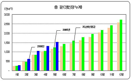 - 5월중 59만029M/T 생산, 2005년 동월(67만182M/T) 대비 12.1% 감소