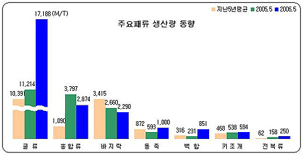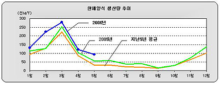 o 천해양식 : 5월중 93만025M/T 생산, 2005년 동월(54만957M/T) 대비 69.3% 증가
