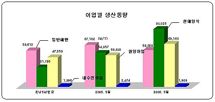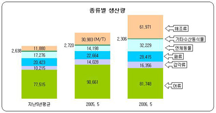 o 2006년 5월중 어업생산량은 22만3025M/T으로 2005년 동월(175,254M/T)대비 27.3% 증가(5년평균 대비 59.4% 증가)
