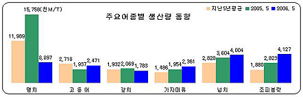 ▶ 어류 : 5월중 38만459M/T 생산, 2005년 동월(45만957M/T) 대비 16.3% 감소