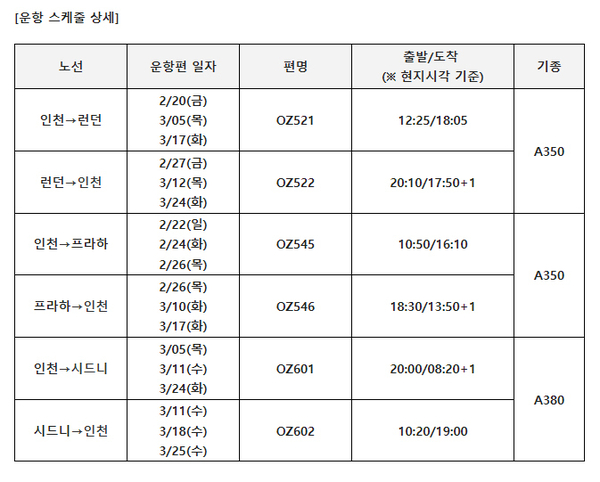 아시아나항공 마일리지 전용기 런던 프라하 시드니로 확대 2 3월 18편 운항