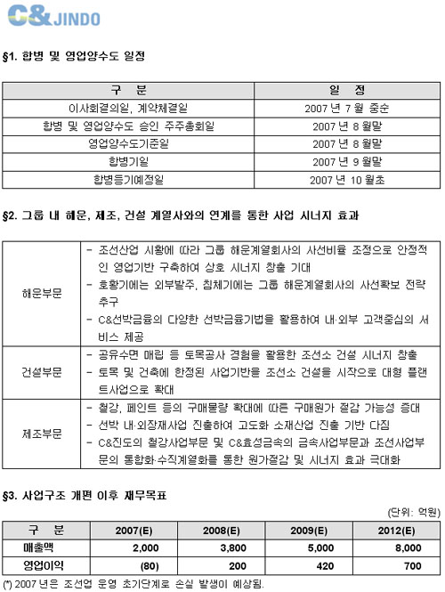㈜C&진도의 영업양수도 및 합병 일정은 해당 회사의 이사회 결의를 이달 중순전후로 진행하고 8월말께 임시주총을 개최하여 본안이 가결된다면 영업양수도 및 합병은 8월말에서 9월말 전후로 완료될 예정이다.