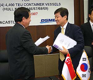 대우조선해양(대표 남상태, www.dsme.co.kr)이 최근 총 14척 21억 달러 상당의 선박을 수주하며 월간 수주 금액이 세계 조선업계 최초로 40억 달러를 돌파해 지난달 세웠던 사상 최고치(30억 달러)를 한달 만에 경신해 세계 조선업계 역사를 다시 썼다.(사진 : 대우조선해양 남상태 사장(오른쪽)과 씨캐슬社 조셉 콱 회장이 계약서를 교환한 뒤 악수를 하고 있다)