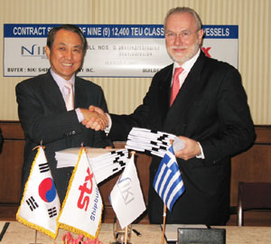 STX 조선은 최근 스위스 제네바에서 강덕수 STX 그룹 회장, 정광석 STX 조선 사장과 테오 필로스 프리오볼로스(Theo Philos Priovolos) 니키(Niki)그룹 사장 등이 참석한 가운데 계약식을 갖고, 그리스 해운선사인 니키(Niki)그룹으로부터 1만2,400 TEU급 초대형 컨테이너선 9척을 15억$ 규모에 수주했다고 밝혔다.