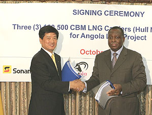 사진설명 : 대우조선해양 남상태 사장(왼쪽)과 소난골사 마뉴엘 비센테 (Manuel D. Vicente)회장이 계약서를 교환한 뒤 악수를 하고 있다.