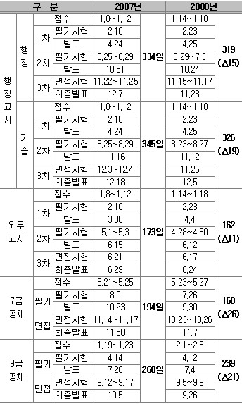 내년도 행정·외무고시 1차 시험은 올해보다 2주 정도 늦은 2월 23일에 치러진다. 하지만 채점기간이 단축돼 모든 공채 합격자는 올해보다 5~23일 빨리 발표된다. 올해 총 334일이 걸리던 행정고시 총 시험일정은 319일로 줄고, 7급·9급 공채도 각각 26일, 21일씩 단축된다.