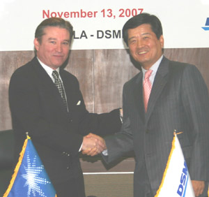 연초 조선 시장의 침체와 선가 하락의 우려를 불식시키며 최근 사상 최고가로 선박을 수주함에 따라 대우조선해양의 수익성도 더욱 좋아질 것으로 예상된다.(사진 : 대우조선해양 남상태 사장(오른쪽)과 벨라社 신조선박 총책임자인 사우드 부카리(Saud Bukhari)씨가 계약을 마친 뒤 악수를 하고 있다)