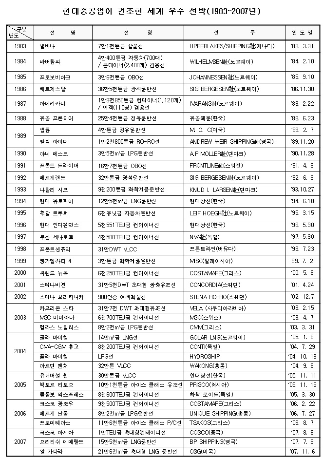 현대중공업그룹은 현대중공업이 조선 수주량 세계 1위에 오른 지난 1983년 이래 25년 연속 총 57척의 세계우수선박을 건조하는 기록을 세웠다.