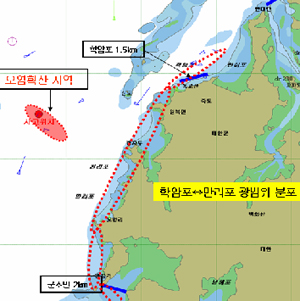 이로 인한 8일 현재 피해면적은 이원~근흥면 일원을 비롯하여 4개면 약 2100㏊ 어장, 해수욕장 6개소 약 221㏊에 이르고 있으나 더욱 확산될 것으로 보인다.