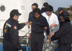 이 사고로 08시44분경 15명 승선원 가운데 미얀마인 선원 묘테이(29.조기장)씨만 구조(사진)되고 14명은 실종돼 3척의 해경정에 의해 선박과 선원들의 수색작업을 지속하고 있다.