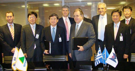 현대중공업이 지난 2월 수주한 선박은 1만3,100TEU급 컨테이너선 9척, 8,600TEU급 컨테이너선 6척, 31만8,000톤급 VLCC 5척, 드릴십과 FPSO 각각 1척, 벌크선 3척 등 총 25척, 57억불(현대삼호 건조분 포함)에 달한다. (사진: 지난 2월 14일 가진 현대중공업 한대윤 부사장과 그리스 메트로스타社의 사주인 테오도르 안젤로포로스(Mr.Theodore Angelopoulos)의 드릴십 계약을 체결했다)