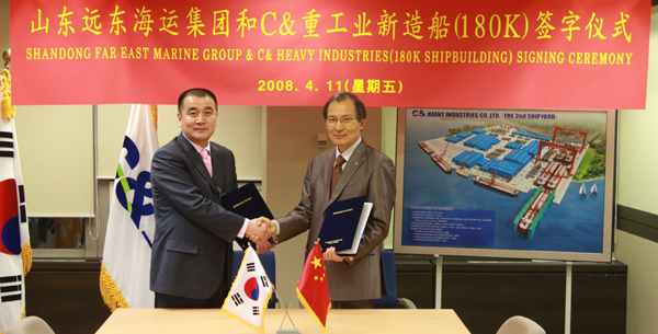 ㈜C&중공업이 산동 파 이스트 마린 그룹’(SHANDONG FAR EAST MARINE GROUP)으로부터 수주한 선박은 18만톤급 벌크선이며 2010년 3월부터 인도될 예정이다. (사진:㈜C&중공업 임갑표 대표(사진 오른쪽)와 중국 산동 파 이스트 마린 그룹 (SHANDONG FAR EAST MARINE GROUP CO., LTD.)의 ‘찌앙 씨 위엔’(江四元) 대표(사진 왼쪽)가 계약서를 교환하고 있다.)
