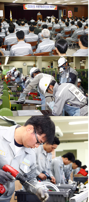 우수 기능인을 발굴하고 모기업과 협력회사 간의 ‘동반자 경영’을 실천하기 위해 마련한 이 대회는 지난 1977년 첫 대회를 가진데 이어 2007년부터 노동부와 함께 실시되고 있다. (사진 5월 31일(토) 열린 현대중공업의 「2008 사내기능경진대회」개회식 모습)