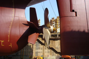 대우조선해양이 그리스의 크리스텐社로부터 수주한 32만톤급 초대형유조선 ‘아스트로 카프리콘(Astro Capricorn)’호에 처음으로 장착된 이 설비는 프로펠러의 바로 앞부분에 4개의 고정날개를 부착해 선미부분에서 프로펠러로 유입되는 물의 흐름을 균일하게 해주는 역할을 한다.(사진:선미 프로펠러 앞부분에 설치된 전류고정 날개)