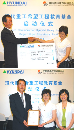 현대중공업은 7월 2일(수) 중국 베이징(北京)에서 열린 ‘항진희망학교(抗震希望學校) 기부금 전달식’에서 중국 청소년발전기금회에 성금을 전달했다고 밝혔다.