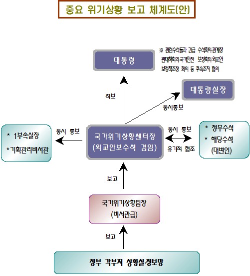 이에 따라 앞으로 위기상황이 발생하면 먼저 국가위기상황센터장이 대통령에게 직접 즉각 보고하고, 동시에 대통령 실장 및 관련 수석들에게 내용을 통보해 국가안전보장회의·관계장관대책회의·긴급 수석회의 소집 등 후속조치를 협의하게 된다.