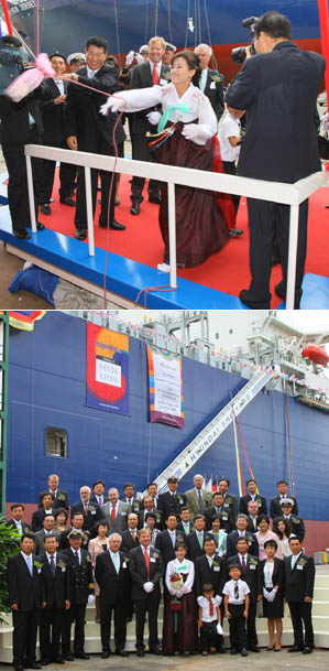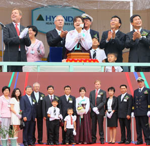 건조가 끝난 선박을 인도 직전에 이름을 지어주는 명명식은 선박건조 과정 중 최대의 이벤트로, 오펜사의 선주는 안정된 노사관계가 ‘최고의 품질’, ‘최고의 고객 서비스’로 이어진데 대한 감사의 표시로 특별히 오종쇄 위원장 부인을 초대한 것으로 알려졌다. (사진:좌측 5번째부터 현대중공업 최길선 사장, 오종쇄 노조위원장, 스폰서 박서진 씨)
