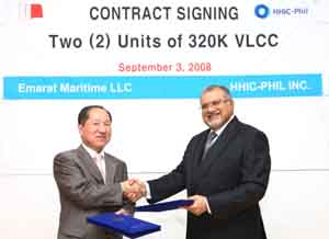 한진중공업(사장 박규원, 사진좌측)은 4일 아랍에미리트의 에마라트 마리타임(Emarat Maritime LLC.)社로부터 VLCC 2척을 3.3억불에 수주했다.