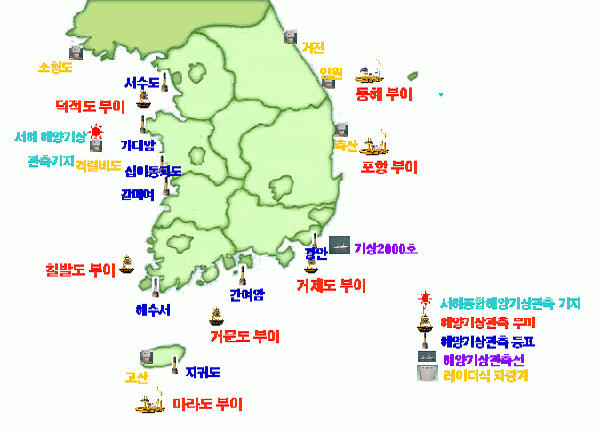 부이에서 관측된 매 시간 관측자료는 위성을 통해 전송되어 해상기상예보, 특보 등 기상정보 생산에 이용되고, 홈페이지를 통해 현재의 해상상태를 알려주어 여객선, 어선 등 각종 선박의 안전운항과 국민들의 해양활동 안전에 크게 기여하고 있다. <사진:전국 해양기상관측망 분포도 >