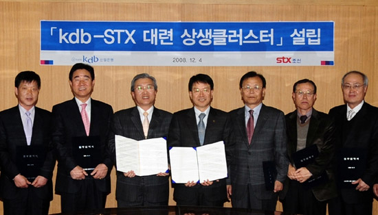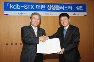 STX조선은 4일 진해 조선소에서 김강수 STX조선 사장과 이성준 산업은행 부행장, 협력회사 대표 등이 참석한 가운데 ‘KDB-STX대련 상생 클러스터’ 지원회사 설립을 위한 업무 협약식을 체결했다.