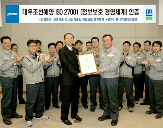 대우조선해양은 노르웨이 인증원인 ‘DNV’로부터 정보보호 국제 표준 인증인 ‘ISO 27001’을 획득, 최근 옥포조선소에서 한국 DNV 인증원 안인균 원장으로부터 인증서를 수여 받았다.