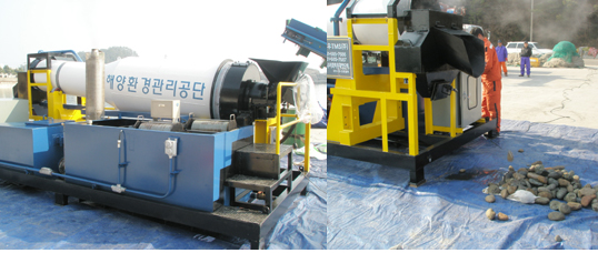 기름오염자갈 자동세척기는 허베이스프리트호 사고와 같이 시커먼 기름이 자갈해안에 부착되었을 때 일일이 사람의 손으로 기름을 닦아내야 했던 것을 자동으로 깨끗하게 세척하는 장비다.