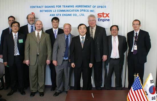 STX엔진이 최근 기술협력을 체결한 해양플랜트 선박 자동화 시스템인 DPS(Dynamic Positioning System)는 해양플랜트의 위치를 자동으로 감지하고 목표위치를 유지하는 첨단 시스템으로, 해양플랜트의 핵심 고부가가치 장비로 통한다.(사진:오른쪽에서 4번째 정동학 STX엔진 대표이사, 오른쪽 3번째 존 폭스(John P. Fox) L-3 Communication DP&CS社 사장)