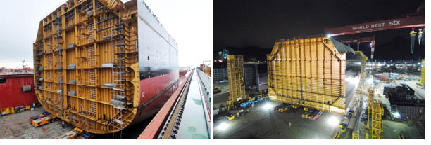 STX조선이 세계 최초로 6,500톤급 초대형 선박블록을 해상에서 탑재하는데 성공했다.(사진: STX조선이 육상에서 건조된 6,500톤급 그린블록을 반잠수식 중량물 운반선인 헤비 리프터선으로 이동하고 있다)