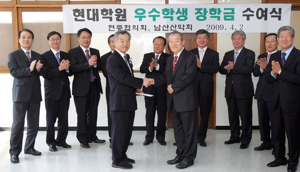 현중협의회와 남산산악회는 2일 오후 2시 현대청운고등학교에서 가정형편이 어려운 현대중·고등학교와 현대청운중·고등학교, 현대정보과학고등학교 등 지역 5개 중·고교 청소년 24명에게 모두 1천200만원의 장학금을 전달했다.